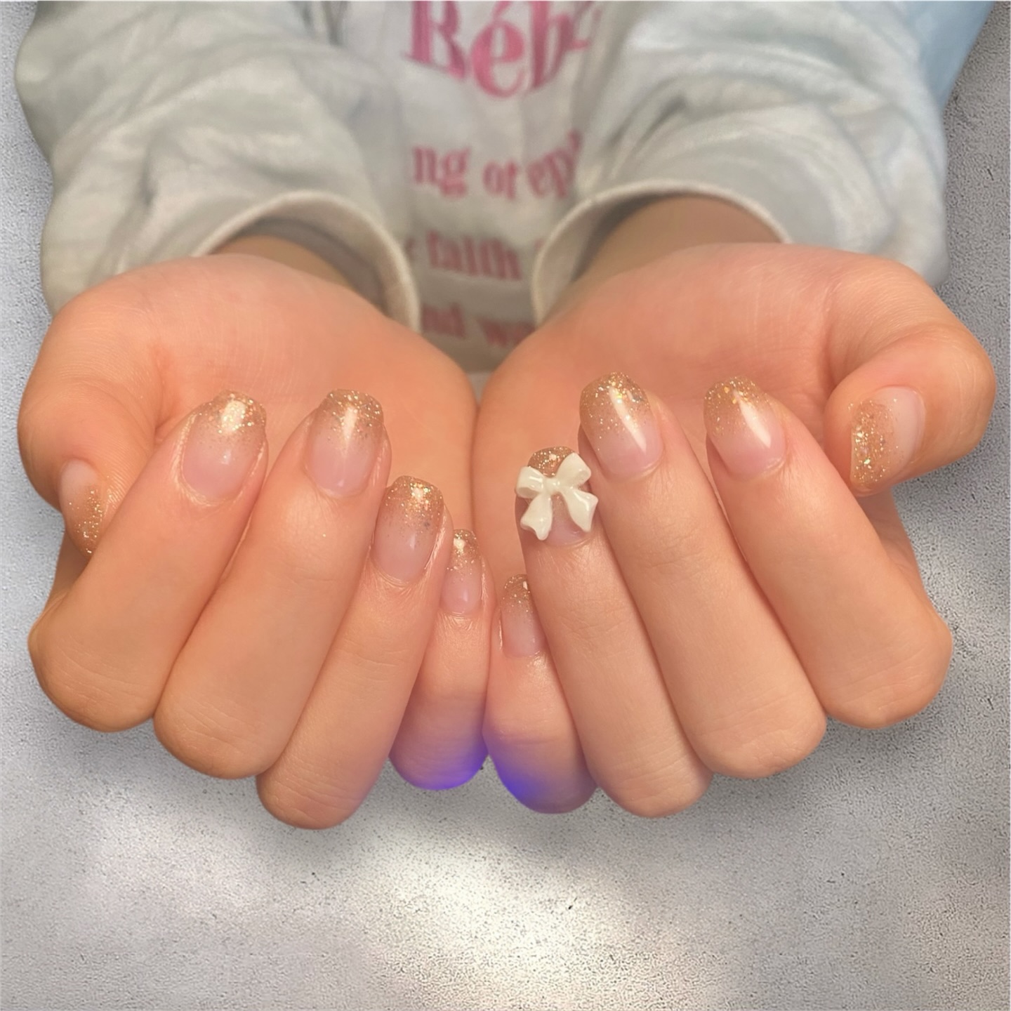 ゴールドのグラデーションに、ちゅるんとしたツヤ感…そして立体リボンでちょっぴり特別感毎日がちょっと楽しくなる、そんなネイルです #ラメグラデーション #リボンネイル #きらきらネイル