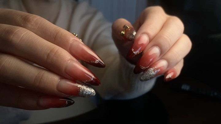 ヌードカラーから深いボルドーへとつながるグラデーションに、ゴ
