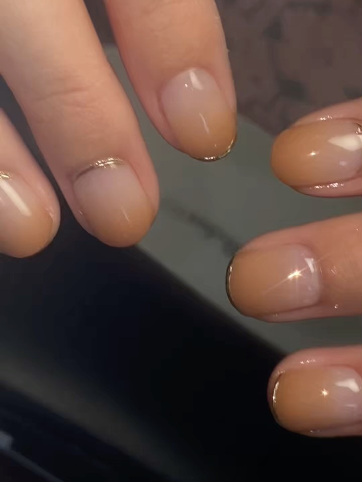 深みブラウンのフレンチとワンカラーを組み合わせて、指先がすっ