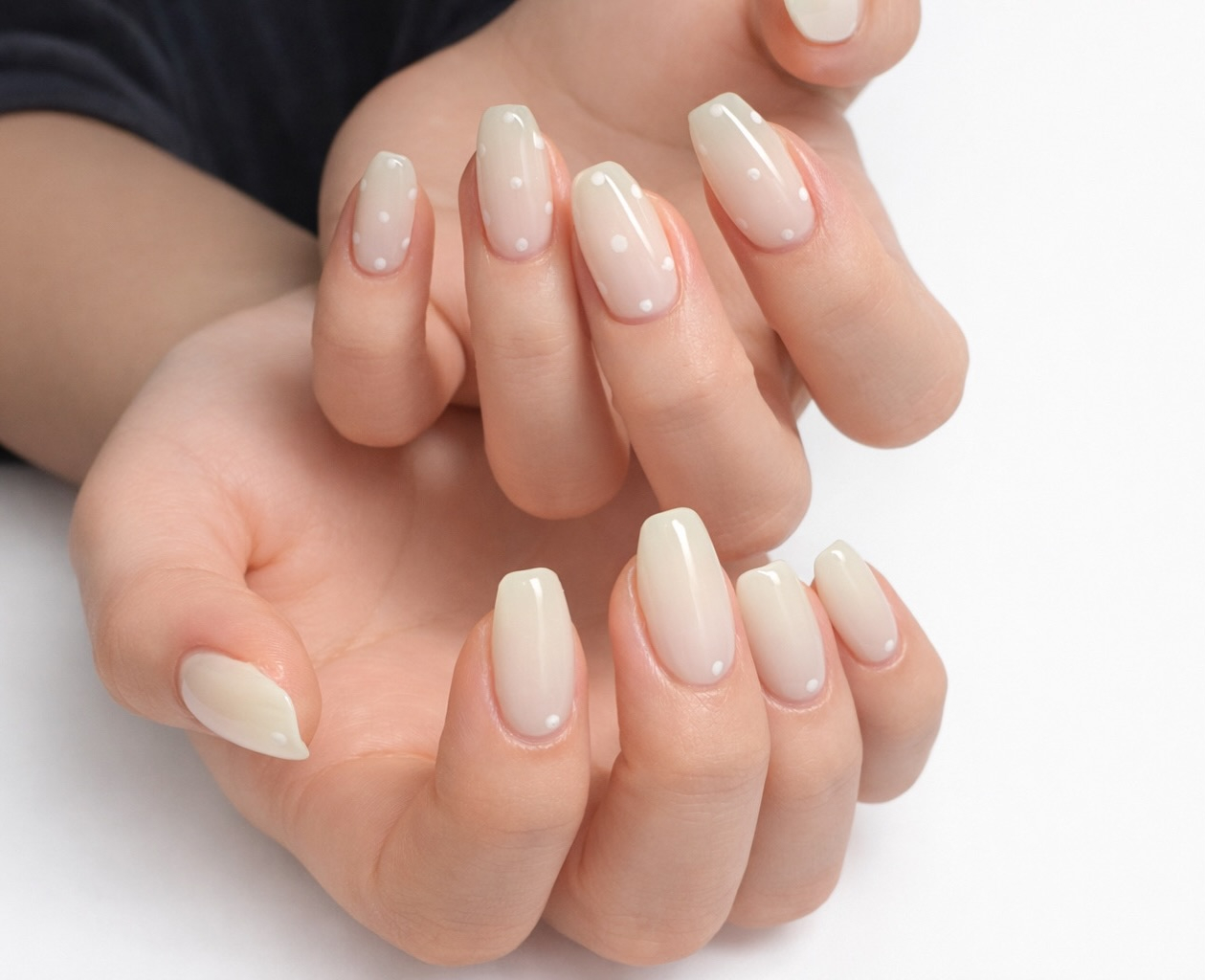 今回のネイルは、柔らかなヌードカラーに小さなドットを添えて、