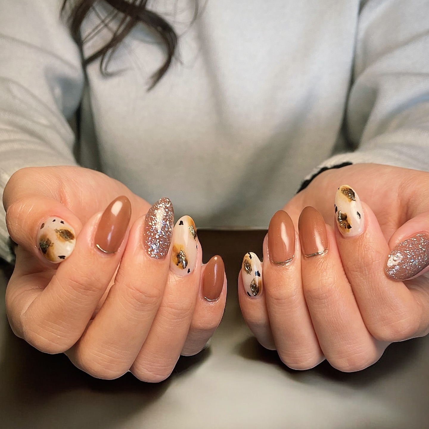 今回のネイルは持ち込みデザインをベースに、秋っぽく仕上げまし