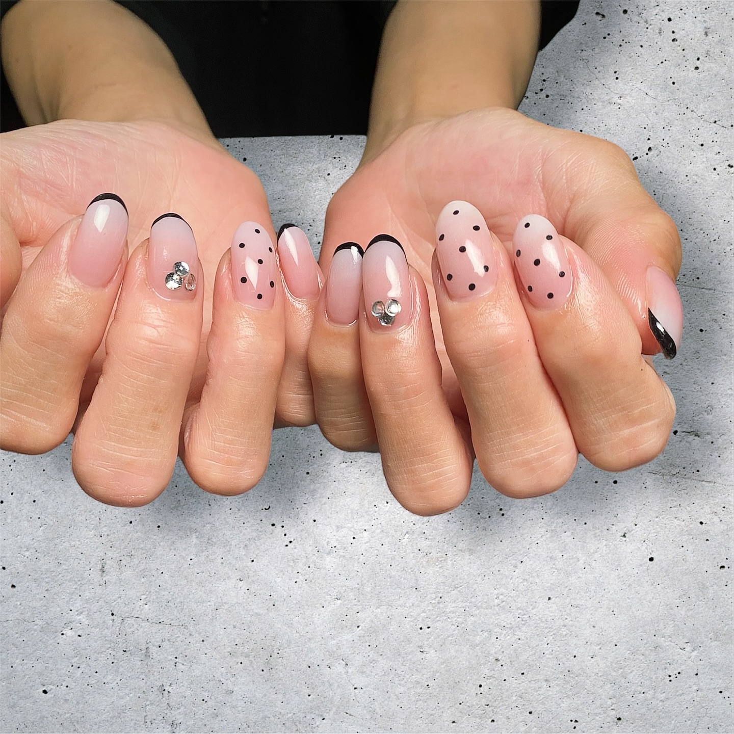 黒のフレンチとドットで、落ち着きと遊び心をミックスストーンの
