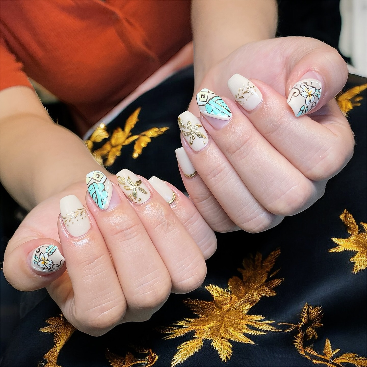 くすみカラーのグラデーションに、ふわっと光るゴールドを入れて✨ “こんな雰囲気にしたい”というイメージがあれば、事前にご相談いただければパーツの仕入れも可能です️ ネイルチップ作成も承ってます✨ nail salon c […] くすみカラーに繊細なアートを添えて、ナチュラルだけど印象的なデザインに☺️ ひとつひとつのモチーフが肝になるネイルです nail salon cheer 徳島市・安宅にあるプライベートネイルサロンです 指先から、あなたら […]