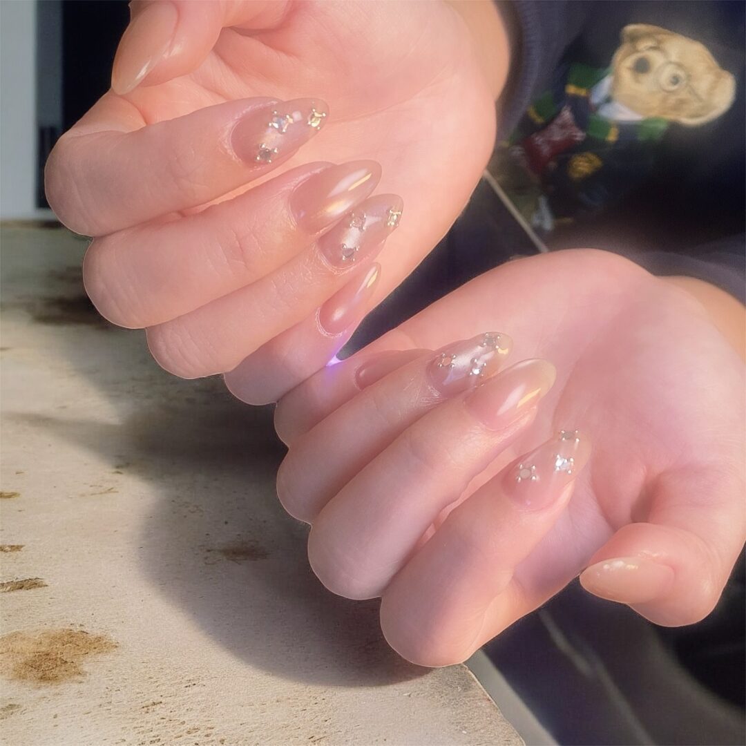 ふんわりとしたピンクネイル✨肌になじむ優しい色合いに、指先に輝く小さなアクセントがとてもキュートです