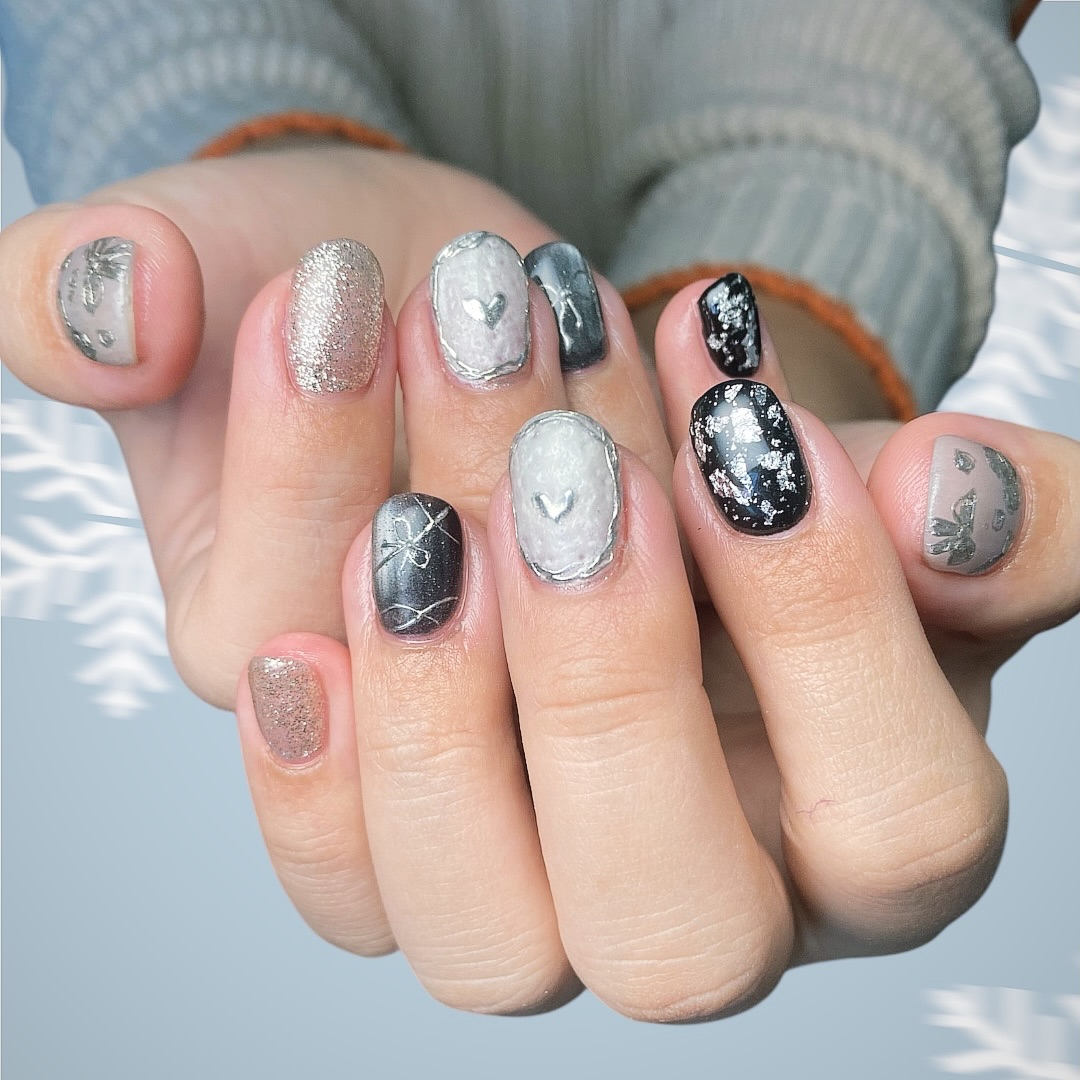 シルバー×ブラックのクールな配色に、ハートや雪の結晶でPOP