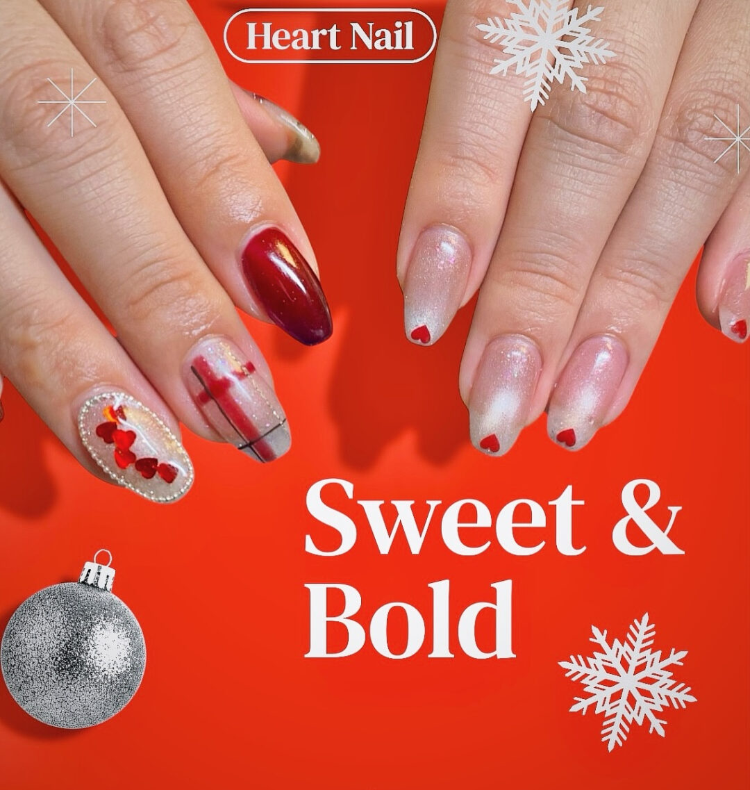 チェック柄はトレンド感たっぷりだし、ハートが可愛らしさをプラスして、どんなシーンにも対応できる万能デザインクリスマスの準備に、このネイルを取り入れてみてはいかが?
