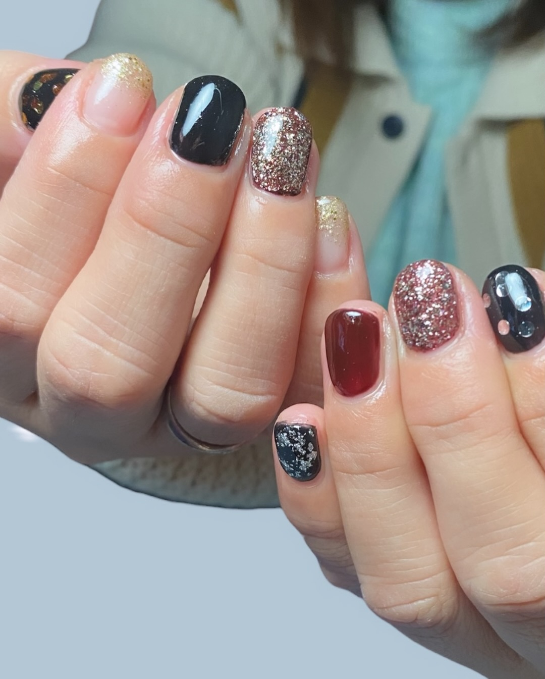 レッド・ゴールド・ブラックのカラフルコンビに、雪の結晶やラメ、丸ホロがキラキラ✨❄️
