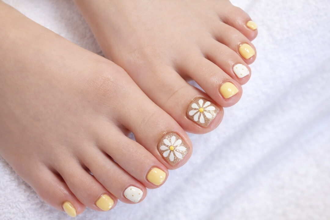 今回のフットネイルは、優しい黄色に、白とゴールドを合わせて☀