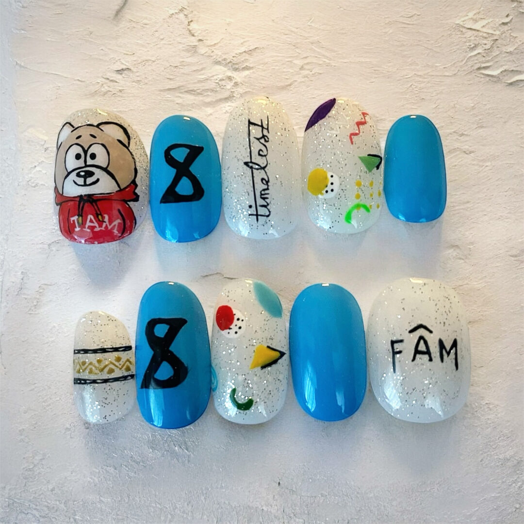 推しネイル 大人ネイル ブルーネイル 8モチーフ ライブネイル コンサート準備 ネイルチップ ネイルデザイン 上品ネイル 指先のときめき 推し活 推し活ネイル ライブ参戦 大人可愛いネイル ネイルのある暮らし