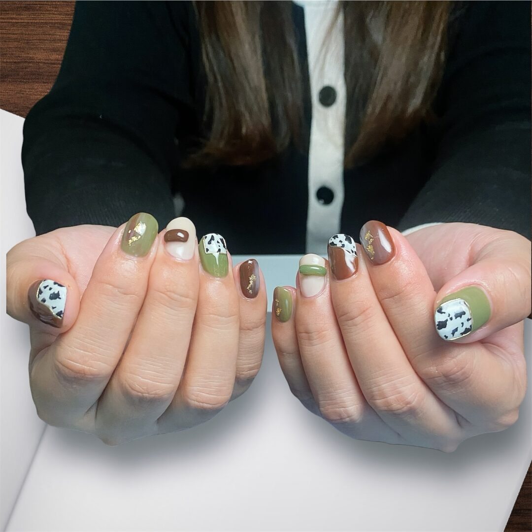 秋っぽくお任せで✨秋の持つ深みを爪先にギュッと詰め込んで、牛柄の遊び心を添えてみましたたまにはアートっぽいアプローチも面白いかもしれませんね!普段とはひと味違う、大人の秋ネイルをぜひ体験してください✨