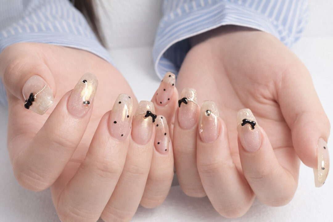 黒のリボンとドットがアクセントになって、上品さの中に遊び心を感じるデザインです